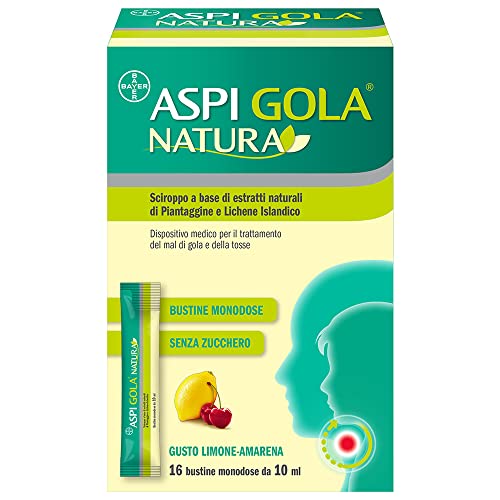 Specifica: Aspi Gola Natura, Sciroppo Mal di gola e Tosse Associata a base di Estratti Naturali di Aloe Vera, Lichene Islandico e Acido Ialuronico, Gusto Limone e Amarena, dai 6 anni, 16 Bustine Monodose 10 ml