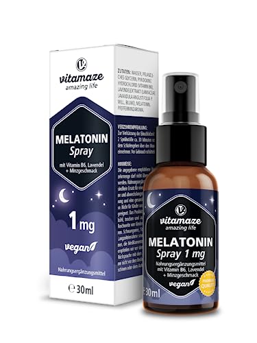 Specifica: Melatonina Spray (6 Mesi) con Vitamina B6 e Estratto di Lavanda, 1 mg di Melatonina per Dormire, Alto Dosaggio, Sonnifero Potente per Dormire, 30 ml Vegan, Gusto Menta. Qualitá Tedesca. Vitamaze®